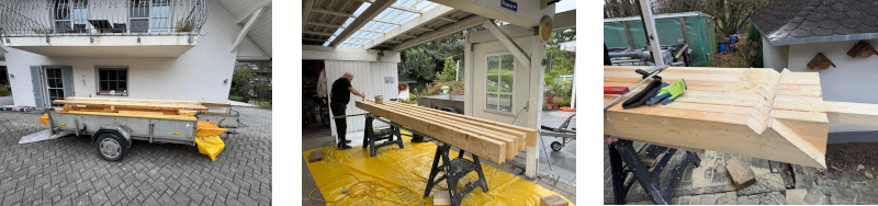 Die Zeit und einige schöne Tage des Spätherbstes konnte Josef Zacharias aktiv nutzen, um einerseits mit seinem Sohn auf dem Toiletten-Anbau der Kapelle den für die Dachkonstruktion notwendigen Ringanker zu betonieren, aber auch an so manchem Abend die diversen Dachbalken und -Sparren einzukaufen und zu sich nach Hause zu transportieren, um diese dann zwischenzeitlich fachgerecht und millimetergenau zuzuschneiden.