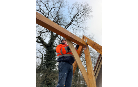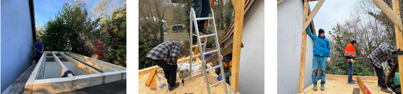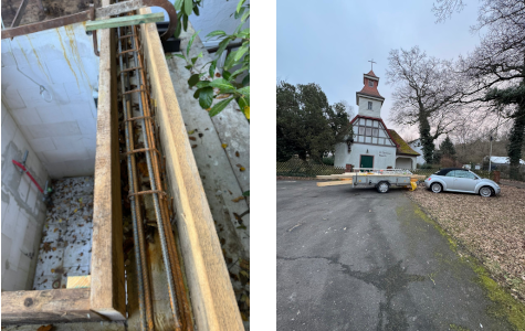 Die Zeit und einige schöne Tage des Spätherbstes konnte Josef Zacharias aktiv nutzen, um einerseits mit seinem Sohn auf dem Toiletten-Anbau der Kapelle den für die Dachkonstruktion notwendigen Ringanker zu betonieren, aber auch an so manchem Abend die diversen Dachbalken und -Sparren einzukaufen und zu sich nach Hause zu transportieren, um diese dann zwischenzeitlich fachgerecht und millimetergenau zuzuschneiden.