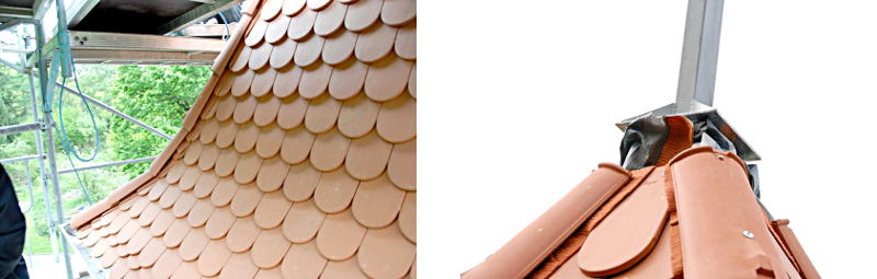 Jetzt fehlt nur noch der vorläufig letzte Schritt: das Decken des Toiletten-Daches mit Biberschwanz-Dachziegeln,